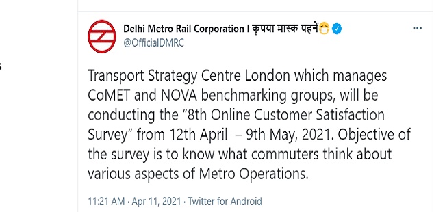 दरअसल, मेट्रो में सफर करने वाले लोगों की यात्रा के तौर-तरीकों, उनकी जरूरतों और उनमें सुधार या फिर परिवर्तन के लिए दिल्ली मेट्रो रेल निगम ने एक ऑनलाइन सर्वे शुरू किया है। दरअसल, ट्रांसपोर्ट स्ट्रेटेजी सेंटर (Transport Strategy Center), इंपीरियल कॉलेज, लंदन 12 अप्रैल यानी सोमवार से 9 मई 2021 के बीच 8वां उपभोक्ता संतुष्टि सर्वे शुरू हो गया है। यह सर्वे पूरी तरह ऑनलाइन है।