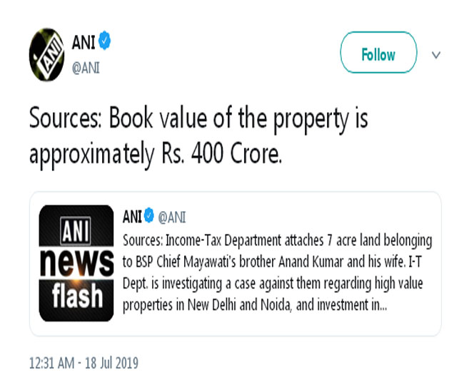 नई दिल्ली/नोएडा, एनआइ। बहुजन समाज पार्टी (Bahujan samaj Party) की राष्ट्रीय अध्यक्ष मायावती (Mayawati) के भाई और पार्टी उपाध्यक्ष आनंद कुमार (anand Kumar) और उनकी पत्नी के खिलाफ आयकर विभाग ने बड़ी कार्रवाई की है। आयकर विभाग ने करोड़ों रुपये के एक बेनामी प्लॉट को अटैच किया है। यह प्लॉट दिल्ली से सटे नोएडा में बताया जा रहा है। यह कुल सात एकड़ का बड़ा प्लॉट है। मिली जानकारी के अनुसार, इस प्लॉट की कीमत तकरीबन 400 करोड़ रुपये बताई जा रही है।