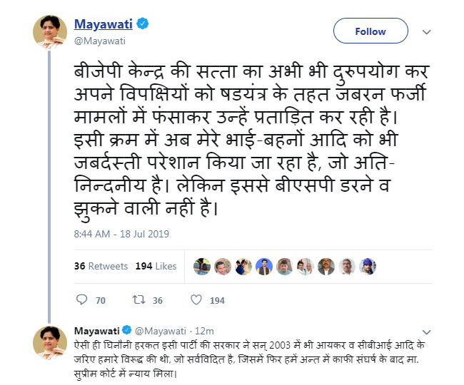 भाई आनंद कुमार पर आयकर विभाग का शिकंजा करने पर मायावती ने भाजपा की कड़ी आलोचना की है। मायावती ने ट्विटर पर कहा कि भाजपा केंद्र की सत्ता का दुरुपयोग कर अपने विपक्षियों को षडयंत्र के तहत जबरन फर्जी मामलों में फंसाकर उन्हें प्रताड़ित कर रही है। इसी क्रम में भाई आनंद को भी परेशान किया जा रहा है। मायावती ने कहा कि ऐसी ही कार्रवाई भाजपा पहले भी कर चुकी है। सुप्रीम कोर्ट से आखिरकार उन्हें न्याय मिला।