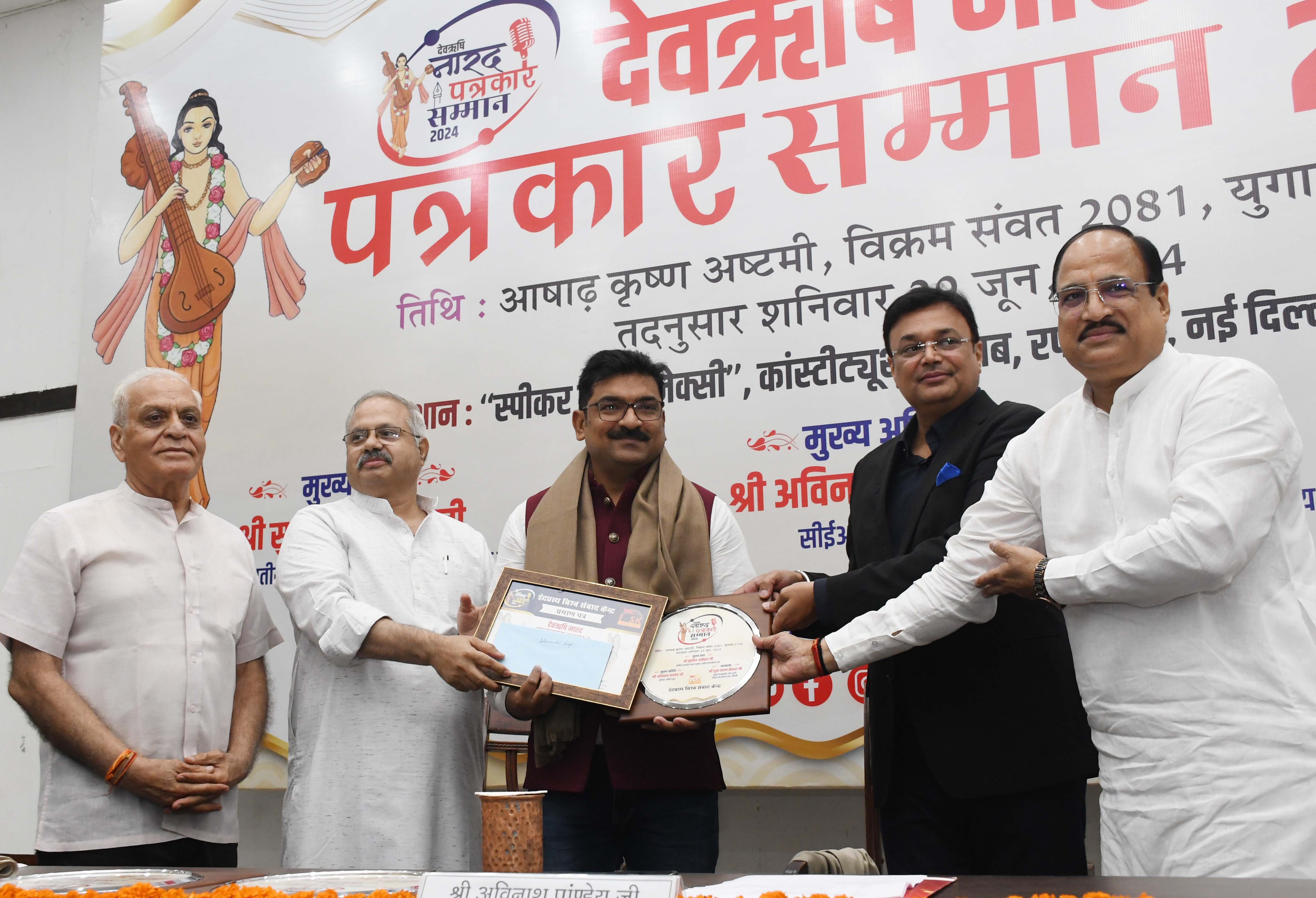 जागरण संवाददाता, नई दिल्ली। दैनिक जागरण के धर्मेंद्र सिंह और नेमिष हेमंत को प्रतिष्ठित देवऋषि नारद पत्रकार सम्मान मिला है। इंद्रप्रस्थ विश्व संवाद केंद्र (आईवीएसके) का यह पुरस्कार उन्हें कांस्टीट्यूशन क्लब में आयोजित समारोह में राष्ट्रीय स्वयंसेवक संघ के अखिल भारतीय प्रचार प्रमुख सुनील आंबेकर, एबीपी न्यूज के सीईओ अविनाश पांडेय व बोथरा फाउंडेशन ट्रस्ट के मुख्य परामर्शक व ट्रस्टी शुभ करण बोथरा ने प्रदान किया। पत्रकारिता जगत में उल्लेखनीय योगदान के लिए जागरण न्यू मीडिया की दीप्ति मिश्रा भी सम्मानित हुईं। शाल ओढ़ाकर सम्मानित करने के साथ सभी को प्रशस्तिपत्र व राशि का चेक प्रदान किया गया।
