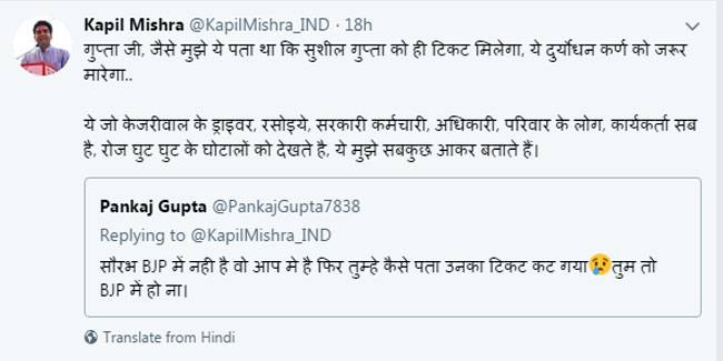 कपिल मिश्रा ने ट्वीट कर कहा कि ये जो केजरीवाल के ड्राइवर, रसोइये, सरकारी कर्मचारी, अधिकारी, परिवार के लोग, कार्यकर्ता सब हैं, रोज घुट-घुट के घोटालों को देखते हैं, ये मुझे सबकुछ आकर बताते हैं।