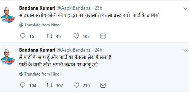सोशल मीडिया पर छिड़े संग्राम के बीच इस 'आप' विधायक बंदना कुमारी ने भी ट्वीट कर कहा कि 'मैं पार्टी के साथ हूं और पार्टी का फैसला मेरा फैसला है। पार्टी के बागी लोग अपनी जबान पर काबू रखें।