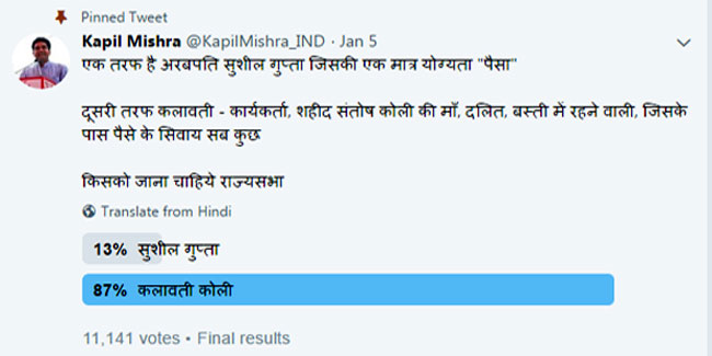इस बीच सोशल मीडिया में 'आप' की सियासत को लेकर बहस जारी है। कपिल मिश्रा ने ट्वीट कर जनता की राय मांगते हुए लिखा कि एक तरफ अरबपति सुशील गुप्ता जिसकी एकमात्र योग्यता पैसा तो वहीं दूसरी तरफ कलावती - कार्यकर्ता, शहीद संतोष कोली की मां, दलित, बस्ती में रहने वाली, जिसके पास पैसे के सिवाय सब कुछ।