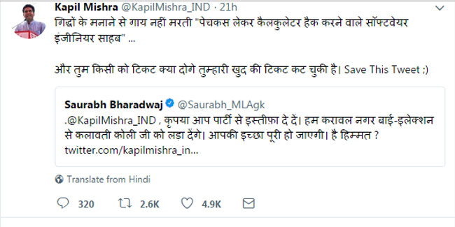 सोशल मीडिया पर सौरभ भारद्वाज को जवाब देते हुए कपिल ने ट्वीट किया कि 'गिद्धों के मनाने से गाय नहीं मरती। पेचकस लेकर कैलकुलेटर हैक करने वाले सॉफ्टवेयर इंजीनियर साहब...और तुम किसी को टिकट क्या दोगे, तुम्हारी खुद की टिकट कट चुकी है। -कपिल मिश्रा, आप विधायक