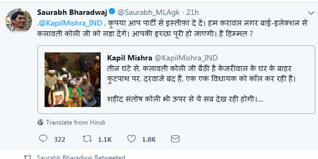 आम आदमी पार्टा के विधायक सौरभ भारद्वाज ने कपिल मिश्रा को आड़े हाथों लेते हुए ट्वीट किया कि 'कृपया आप पार्टी से इस्तीफा दे दें। हम करावल नगर बाई-इलेक्शन से कलावती कोली जी को लड़ा देंगे। आपकी इच्छा पूरी हो जाएगी। है हिम्मत? सौरभ भारद्वाज।