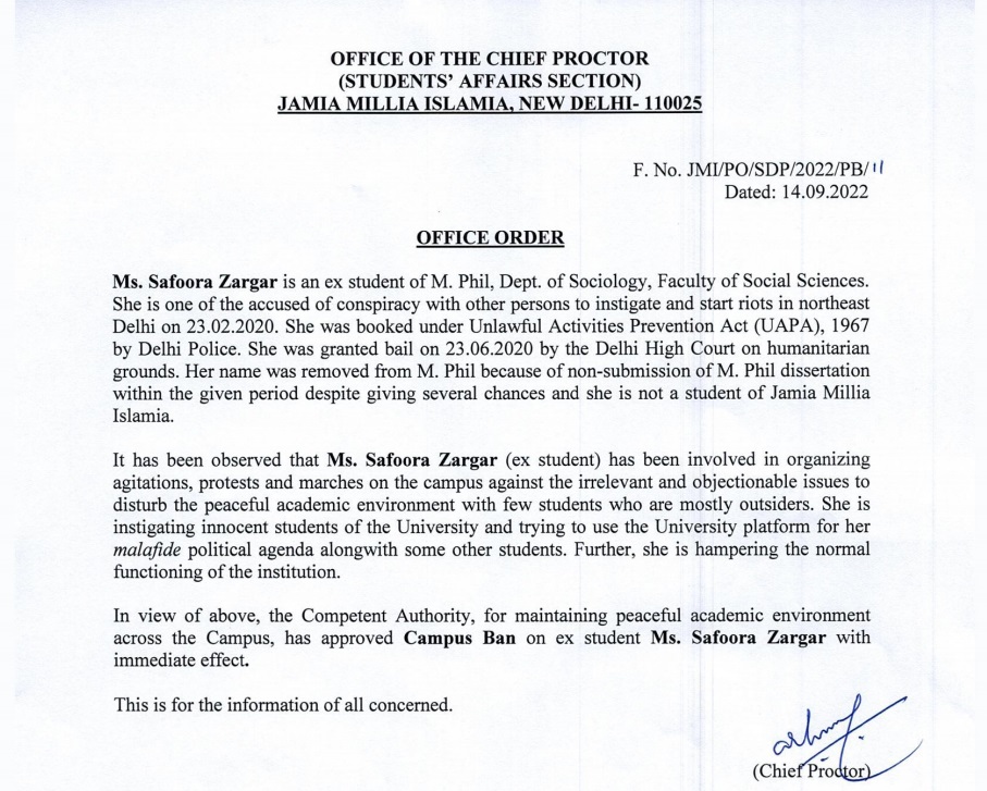 जामिया मिल्लिया इस्लामिया यूनिवर्सिटी (Jamia Millia Islamia University) ने मुस्लिम एक्टिविस्ट सफूरा जरगर (Safoora Zargar) पर बड़ा एक्शन लेते हुए उसको कैंपस में बैन कर दिया है। अभी कुछ दिन पहले ही उसका यूनिवर्सिटी ने दाखिला रद कर दिया था।