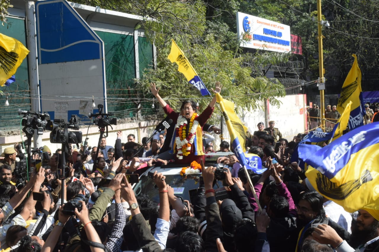 जीतने के बाद मतगणना केंद्र के बाहर अपनी कर पर खड़ी होकर समर्टन का अभिवादन करती आतिशी