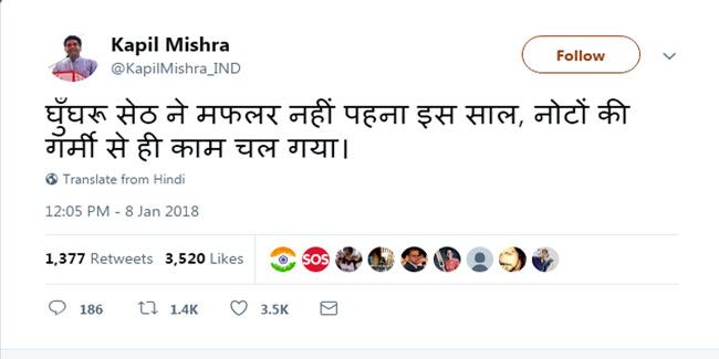 नई दिल्ली [जेएनएन]। आम आदमी पार्टी के बागी विधायक कपिल मिश्रा दिल्ली के सीएम अरविंद केजरीवाल के खिलाफ सख्त रुख अपनाए हुए हैं। सोशल मीडिया को हथियार बनाकर मिश्रा ने केजरीवाल पर हमले तेज कर दिए हैं। राज्यसभा टिकटों के एलान के बाद आम आदमी पार्टी में छिड़ी जंग थमती नहीं दिख रही है। फिलहाल कपिल ने एक बार फिर सोशल मीडिया के जरिए केजरीवाल पर सीधा वार किया है। इस बार कपिल ने ट्वीट कर कहा है कि घुंघरू सेठ ने मफलर नहीं पहना इस साल, नोटों की गर्मी से ही काम चल गया।