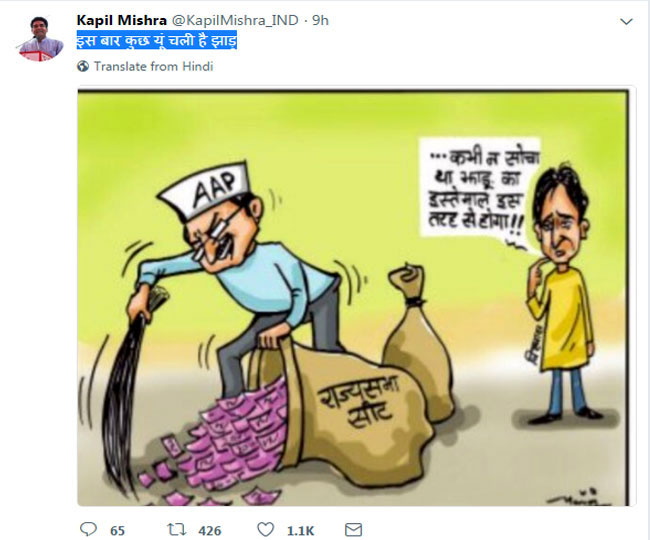 यह पहला मौका नहीं है जब कपिल मिश्रा ने राज्यसभा सीट के लिए उम्मीदवारों के चयन पर सवाल उठाते हुए केजरीवाल पर निशाना साधा है। इससे पहले मिश्रा केजरीवाल पर राज्यसभा की टिकट बेचने के आरोप भी लगा चुके हैं। हाल ही में कपिल ने ट्वीट कर आम आदमी पार्टी पर निशाना साधा था। कपिल ने ट्वीट कर कहा था कि इस बार कुछ यूं चली है झाड़ू। इस ट्वीट के साथ उन्होंने एक कार्टून की तस्वीर भी लगाई थी।