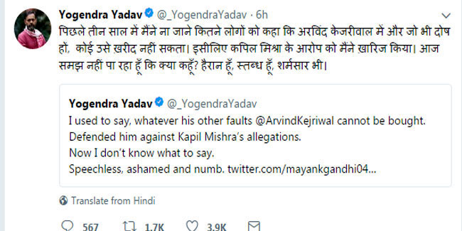 कुमार विश्वास व कपिल मिश्रा के अलावा 'आप' के पुराने साथियों ने भी केजरीवाल की निष्ठा पर सवाल उठाए हैं। केजरीवाल के साथी रहे योगेंद्र यादव ने तीखी प्रतिक्रिया देते हुए कहा था कि मैं पिछले तीन साल से कह रहा था कि केजरीवाल को कोई खरीद नहीं सकता है। कपिल मिश्रा के आरोपों को भी मैंने खारिज किया। मगर आज मैं शर्मसार हूं। समझ में नहीं आ रहा क्या कहूं।