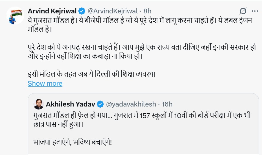 उन्होंने X पर लिखा, "यह गुजरात मॉडल है। यह BJP का मॉडल है, जिसे वे पूरे देश में लागू करना चाहते हैं। यह डबल इंजन मॉडल है। वे पूरे देश को अशिक्षित रखना चाहते हैं। एक भी ऐसा राज्य बताइए जहां उनकी सरकार हो और उन्होंने शिक्षा को बर्बाद न किया हो।" केजरीवाल ने आगे दावा किया कि इसी मॉडल के तहत अब दिल्ली की शिक्षा व्यवस्था को भी नष्ट करने की कोशिश की जा रही है।