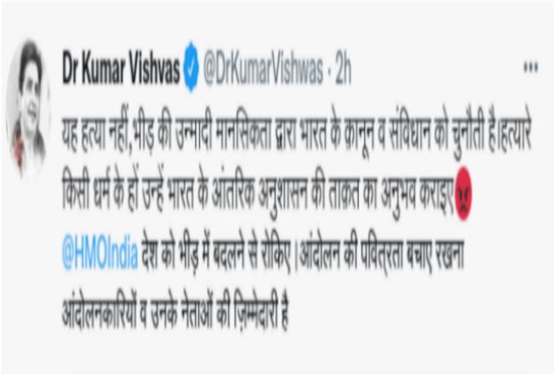 हत्या की इस वारदात के बारे में पता चलने पर जाने-माने कवि कुमार विश्वास ने भी अपनी प्रतिक्रिया व्यक्त की। अपने इंटरनेट मीडिया के ट्विटर एकाउंट पर प्रतिक्रिया व्यक्त करते हुए उन्होंने कहा कि यह हत्या नहीं, भीड़ की उन्मादी मानसिकता द्वारा भारत के क़ानून व संविधान को चुनौती है।हत्यारे किसी धर्म के हों उन्हें भारत के आंतरिक अनुशासन की ताक़त का अनुभव कराइए, @HMOIndia देश को भीड़ में बदलने से रोकिए।आंदोलन की पवित्रता बचाए रखना आंदोलनकारियों व उनके नेताओं की ज़िम्मेदारी है