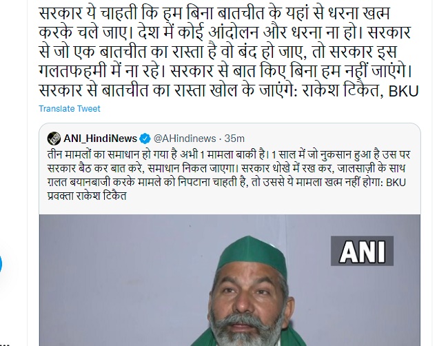 इसके अलावा राकेश टिकैत ने यह भी कहा कि तीन मामलों का समाधान हो गया है अभी 1 मामला बाकी है। 1 साल में जो नुकसान हुआ है उस पर सरकार बैठकर बात करे, समाधान निकल जाएगा। सरकार धोखे में रखकर, जालसाज़ी के साथ ग़लत बयानबाजी करके मामले को निपटाना चाहती है, तो उससे ये मामला खत्म नहीं होगा। गौरतलब है कि 24 घंटे के भीतर राकेश टिकैत ने केंद्र सरकार लगातार दो धमकियां दी हैं।