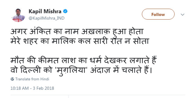 कुमार विश्वास के बाद आम आदमी पार्टी से निष्कासित पूर्व मंत्री कपिल मिश्रा ने इस घटना के बहाने दिल्ली के मुखिया अरविंद केजरीवाल पर निशाना साधा। मिश्रा ने ट्वीट कर कहा कि अगर अंकित का नाम अख़लाक़ हुआ होता, मेरे शहर का मालिक कल सारी रात न सोता, मौत की कीमत लाश का धर्म देखकर लगाते हैं, वो दिल्ली को 'मुग़लिया' अंदाज़ में चलाते हैं।