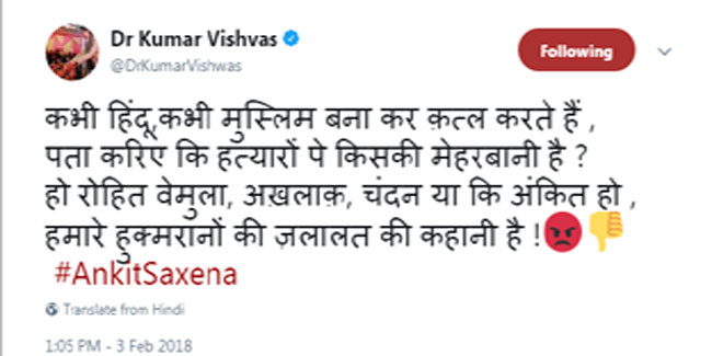 कुमार विश्वास ने ट्वीट कर कहा कि 'कभी हिंदू,कभी मुस्लिम बना कर कत्ल करते हैं, पता करिए कि हत्यारों पे किसकी मेहरबानी है? हो रोहित वेमुला, अखलाक, चंदन या कि अंकित हो, हमारे हुक्मरानों की ज़लालत की कहानी है!