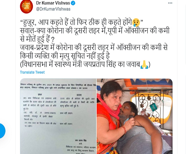 'आक्सीसन से नहीं हुई यूपी में किसी मरीज की मौत' योगी के मंत्री के बयान पर पढ़िये कुमार विश्वास का ट्वीट