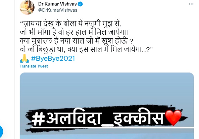 कुमार विश्वास ने नए साल के आगमन और 2021 की विदाई पर किया भावुक ट्वीट, आप भी पढ़िये
