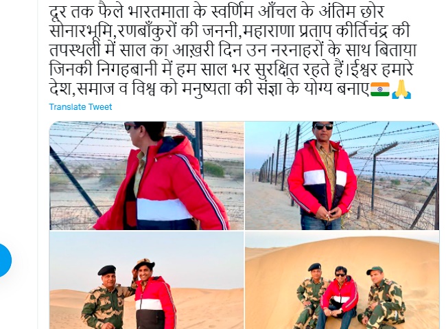वहीं, एक अन्य विषय में किए गए ट्वीट में कुमार विश्वास भारतीय सैनिकों के साथ नजर आ रहे हैं। 'दूर तक फैले भारतमाता के स्वर्णिम आँचल के अंतिम छोर सोनारभूमि,रणबाँकुरों की जननी,महाराणा प्रताप कीर्तिचंद्र की तपस्थली में साल का आख़री दिन उन नरनाहरों के साथ बिताया जिनकी निगहबानी में हम साल भर सुरक्षित रहते हैं।ईश्वर हमारे देश,समाज व विश्व को मनुष्यता की संज्ञा के योग्य बनाए।'