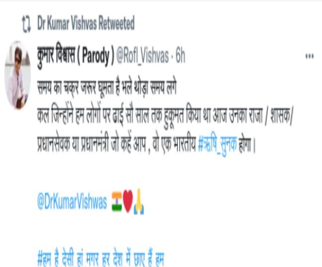कवि कुमार विश्वास ने भी अपने इंटरनेट मीडिया एकाउंट ट्विटर पर ऋषि सुनक को लेकर एक ट्वीट किया है। इस ट्वीट के माध्यम से उन्होंने ढाई सौ साल पहले के समय को याद किया है। ढाई सौ साल पहले किस तरह से अंग्रेजों ने हमारे देश पर राज किया और आज समय पलटा है जब एक भारतीय अंग्रेजों पर शासन करने की तैयारी कर रहा है।