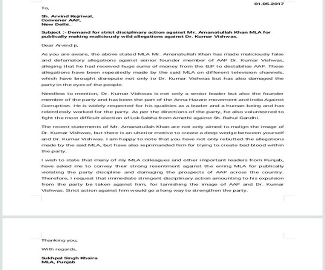 गौरतलब है कि विधायक अमानतुल्ला खान ने रविवार को पार्टी के वरिष्ठ नेता कुमार विश्वास पर आरोप लगाया था कि वह पार्टी तोड़ने की साजिश रच रहे हैं और उन्होंने कुछ विधायकों से 30-30 करोड़ रुपये के बदले भाजपा में शामिल होने के लिए कहा है।