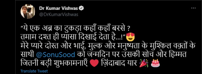 एक्टर सोनू सूद को जन्मदिन की बधाई देते हुए कुमार विश्वास ने लिखी शानदार शायरी