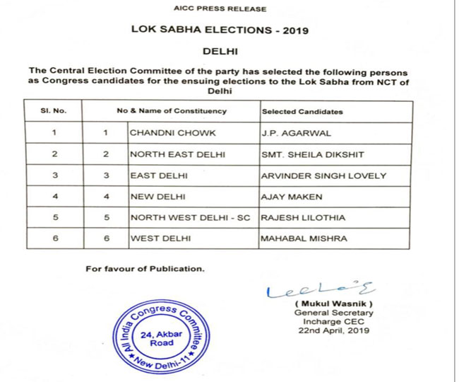 कांग्रेस ने दिल्ली की 6 सीटों पर घोषित किए प्रत्याशी, जानें- कौन-कहां से लड़ेगा चुनाव