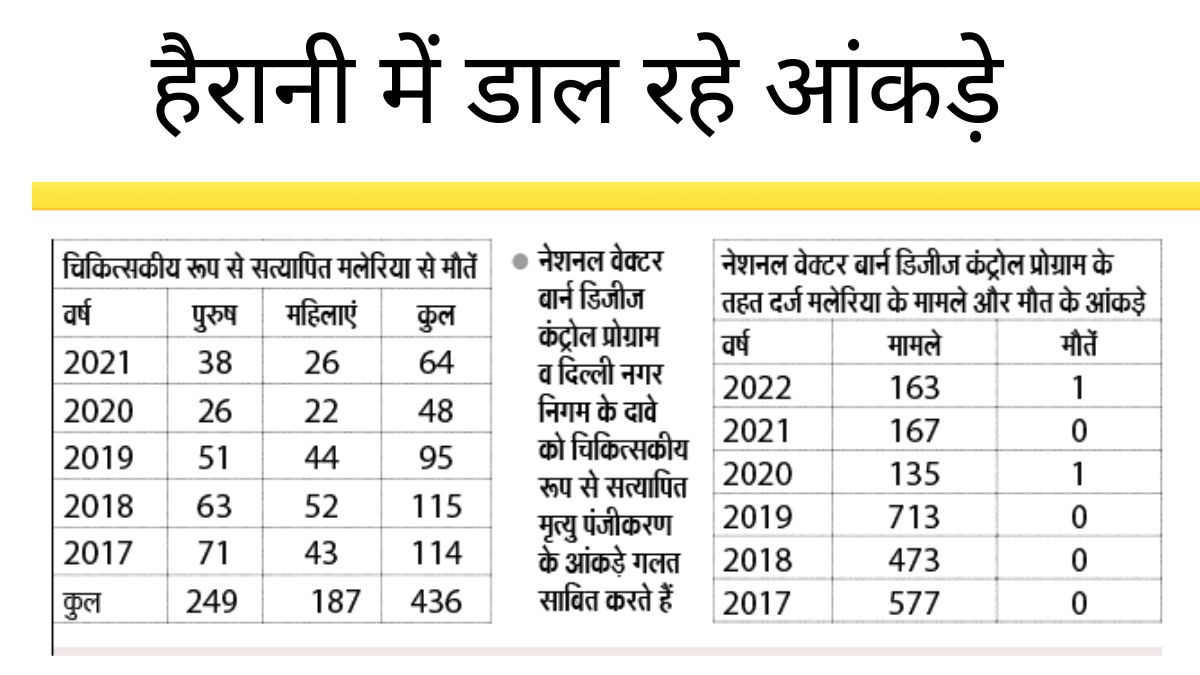 इस लिहाज से छह वर्षों में मलेरिया से दिल्ली में सिर्फ दो मरीजों की मौत हुई। दूसरी ओर इस दावे को चिकित्सकीय रूप से सत्यापित मृत्यु पंजीकरण के आंकड़े गलत साबित करते हैं। मृत्यु पंजीकरण की रिपोर्ट के अनुसार वर्ष 2017 से वर्ष 2021 के बीच दिल्ली में 436 लोगों की मौत का कारण मलेरिया बीमारी बनी। इससे स्पष्ट है कि मलेरिया की रोकथाम के लिए चलाए जाने वाले अभियान और जमीनी हकीकत में अंतर है।
