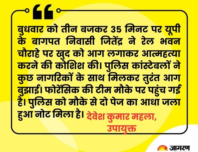 उपायुक्त देवेश कुमार महला के मुताबिक, बुधवार को तीन बजकर 35 मिनट पर यूपी के बागपत निवासी जितेंद्र ने रेल भवन चौराहे पर खुद को आग लगाकर आत्महत्या करने की कोशिश की। पुलिस कांस्टेबलों ने कुछ नागरिकों के साथ मिलकर तुरंत आग बुझाई। फोरेंसिक की टीम मौके पर पहुंच गई है। पुलिस को मौके से दो पेज का आधा जला हुआ नोट मिला है।