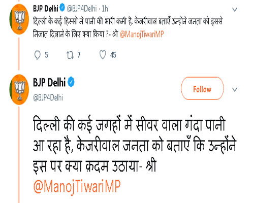 भाजपा नेता मनोज तिवारी ने कहा कि मई में ही समर एक्शन प्लान बन जाना चाहिए था, जिससे कि समस्या का समाधान किया जा सके। उन्होंने कहा कि केजरीवाल जल बोर्ड के मुखिया हैं। जल बोर्ड घाटे में जा रहा है। वह दिल्ली के विभिन्न इलाके में जाकर लोगों से झूठे वादे कर रहे हैं। हाल में मालवीय नगर में नाराज लोगों को तीन दिन में समस्या हल करने का वादा किया था, लेकिन समस्या दूर नहीं हुई।