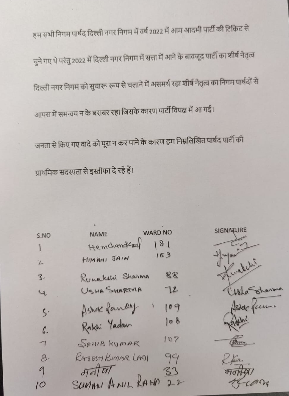 सभी पार्षदों ने सामूहिक इस्तीफा सौंपा है। इसमें उन्होंने लिखा कि हम सभी निगम पार्षद दिल्ली नगर निगम में वर्ष 2022 में आम आदमी पार्टी की टिकट से चुने गए थे, परंतु 2022 में दिल्ली नगर निगम में सत्ता में आने के बावजूद पार्टी का शीर्ष नेतृत्व दिल्ली नगर निगम को सुचारू रूप से चलाने में असमर्थ रहा। शीर्ष नेतृत्व का निगम पार्षदों से आपस में समन्वय न के बराबर रहा, जिसके कारण पार्टी विपक्ष में आ गई। जनता से वादे को पूरा न कर पाने के हम सभी पार्षद पार्टी की प्राथमिक सदस्यता से इस्तीफा दे रहे हैं।