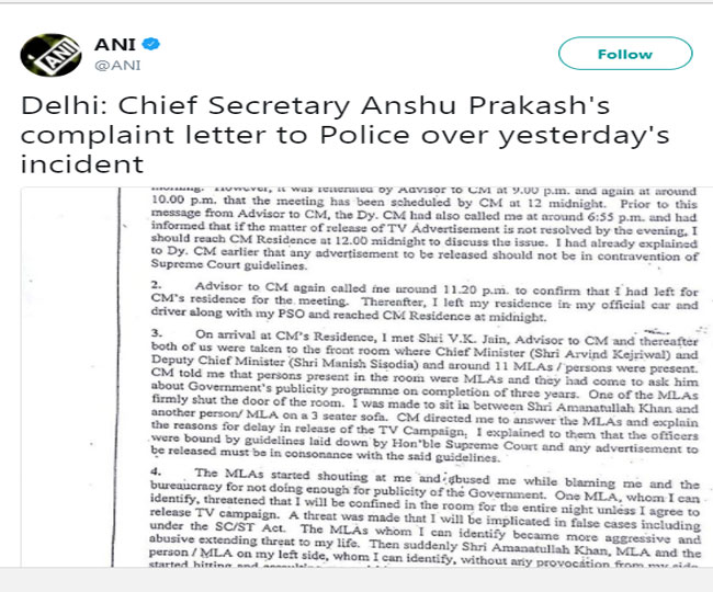 वहीं, दिल्ली के मुख्य सचिव अंशु प्रकाश ने खुद के साथ हुई हाथापाई और अपशब्द कहने पर दिल्ली पुलिस को शिकायत दी है। इसमें कोई दिल्ली पुलिस से आरोपियों के खिलाफ कार्रवाई करने की मांग की। वहीं, जानकारी सामने आ रही है कि अंशु प्रकाश की शिकायत पर पुलिस ने AAP के दो विधायकों के खिलाफ मारपीट का मामला दर्ज कर लिया है। इनमें से एक ओखला से AAP विधायक अमानतुल्लाह खान का नाम है।