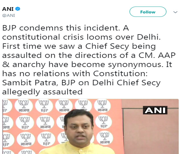 भाजपा इस पूरे प्रकरण की निंदा करती है। साथ ही भाजपा प्रवक्ता ने कहा कि दिल्ली पर संवैधानिक संकट मंडरा रहा है। ऐसा पहली बार है जब किसी मुख्यमंत्री के आधार पर मुख्य सचिव के साथ ऐसी बदतमीजी की गई है। AAP और अराजकता दोनों एक-दूसरे के पर्यायवाची बन गए हैं। इनका संविधान से कोई वास्ता नहीं है।