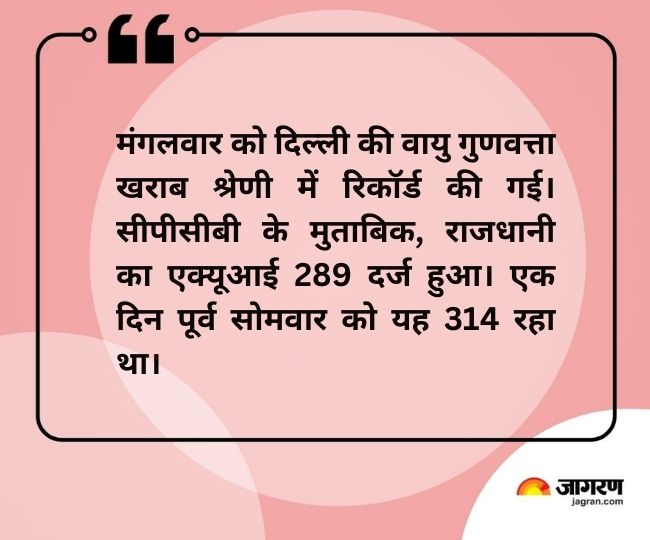 मंगलवार को दिल्ली की वायु गुणवत्ता खराब श्रेणी में रिकॉर्ड की गई। सीपीसीबी के मुताबिक, राजधानी का एक्यूआई 289 दर्ज हुआ। एक दिन पूर्व सोमवार को यह 314 रहा था। यानी 24 घंटे के दौरान इसमें 25 अंकों की गिरावट आई है। एनसीआर के शहरों में भी कहीं मध्यम और कहीं खराब श्रेणी में एक्यूआइ दर्ज किया गया।
