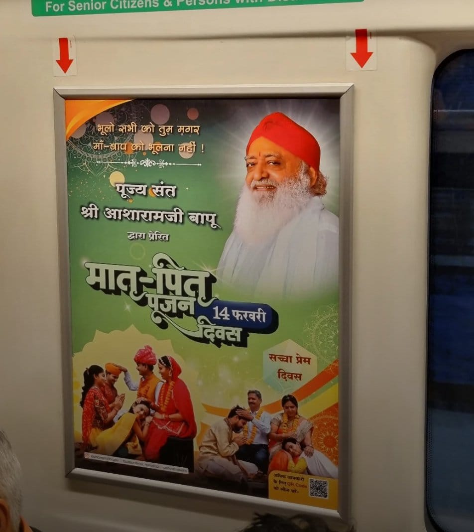 मेट्रो में लगे विज्ञापन होर्डिंग में आसाराम की मुस्कुराती हुई तस्वीर है और 14 फरवरी को मातृ-पितृ पूजन दिवस मनाने की अपील की गई है। साथ ही विज्ञापन के सबसे ऊपर शीर्षक में आसाराम को पूजनीय बताया गया है। लोगों को यह विज्ञापन पसंद नहीं आया।