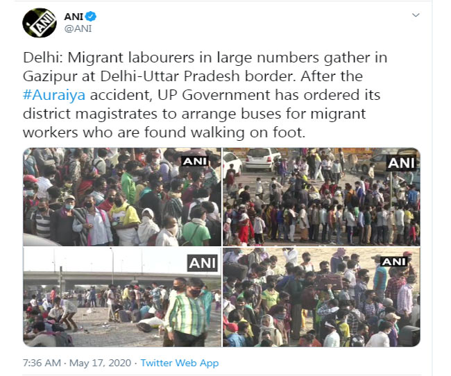 इससे पहले दिल्ली-यूपी बॉर्डर पर बड़ी संख्या में मजदूर जुट गए थे। मिला जानकारी के मुताबिक, औरैया सड़क हादसे के बाद यूपी सरकार के उस आदेश के बाद यह भीड़ जुट गई थी जिसमें कहा गया है कि जो मजदूर पैदल जा रहे हैं उन्हें प्रशासन बस उपलब्ध कराएगी।