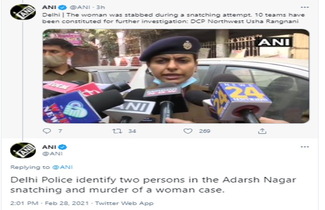 डीसीपी नॉर्थवेस्ट उषा रंगनानी ने बताया कि शनिवार को आदर्श नगर इलाके में लूट का विरोध करने पर एक झपटमार ने चाकू मार दिया था। इलाज के दौरान महिला की अस्पताल में मौत हो गई। इस मामले में दो व्यक्तियों की पहचान की गई है। जांच के लिए 10 टीमों को लगाया गया है। आरोपितों को जल्द गिरफ्तार किया जाएगा।