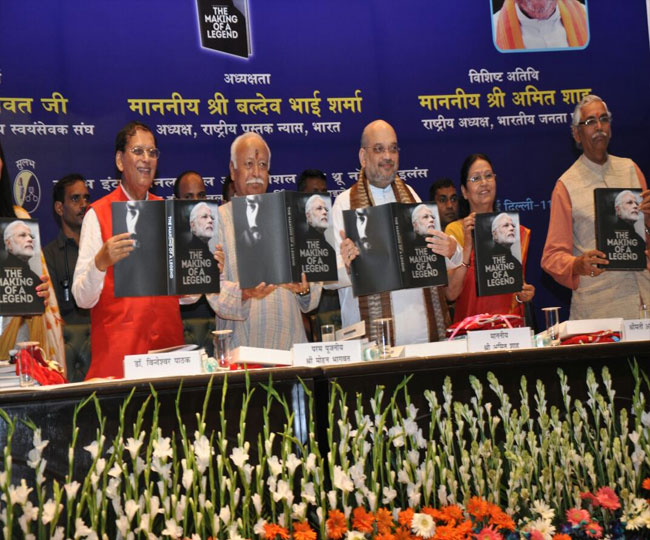 नई दिल्ली (जेएनएन)। दिल्ली के मावलंकर हॉल में बुधवार को प्रधानमंत्री नरेंद्र मोदी की जीवन पर लिखी पुस्तक 'द मेकिंग ऑफ ए लेजेंड' का विमोचन हुआ। पुस्तक विमोचन के दौरान भाजपा के राष्ट्रीय अध्यक्ष अमित शाह और संघ प्रमुख मोहन भागवत खास आकर्षण का केंद्र रहे। पुस्तक के लेखक सुलभ इंटरनेशनल के संस्थापक बिंदेश्वरी पाठक है।