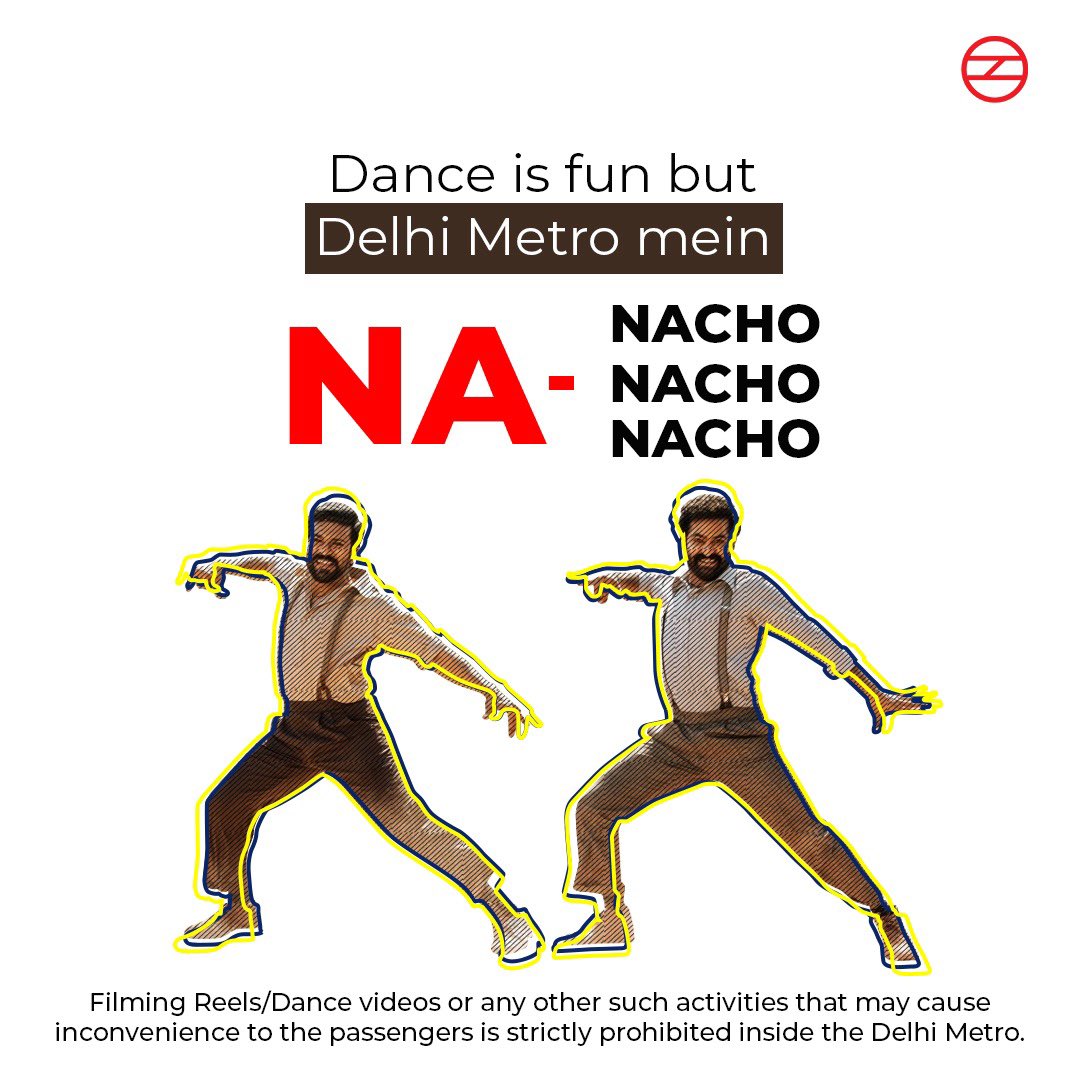 डीएमआरसी ने सोशल मीडिया पर एक मीम (Meme) शेयर किया है, जिसमें वो लोगों को न नाचने की सलाह दे रही है। उन्होंने आरआरआर (RRR Movie) फिल्म का ऑस्कर के लिए नॉमिनेट मशहूर गाना नाटू-नाटू (Naatu-Naatu) का प्रयोग कर लोगों को नाचने से मना किया है। सावधान करते हुए लिखा है "नाचना मजेदार है, लेकिन दिल्ली मेट्रो में ना-नाचो।"