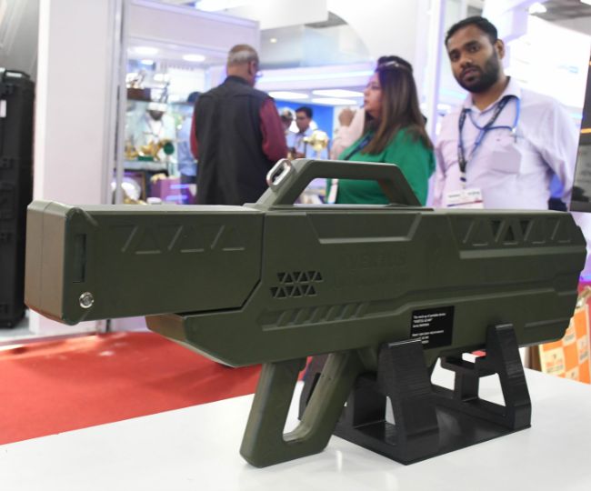 पुलिस एक्सपो-2025 में प्रदर्शित लेजर एंटी ड्रोन गन। फोटो: ध्रुव कुमार