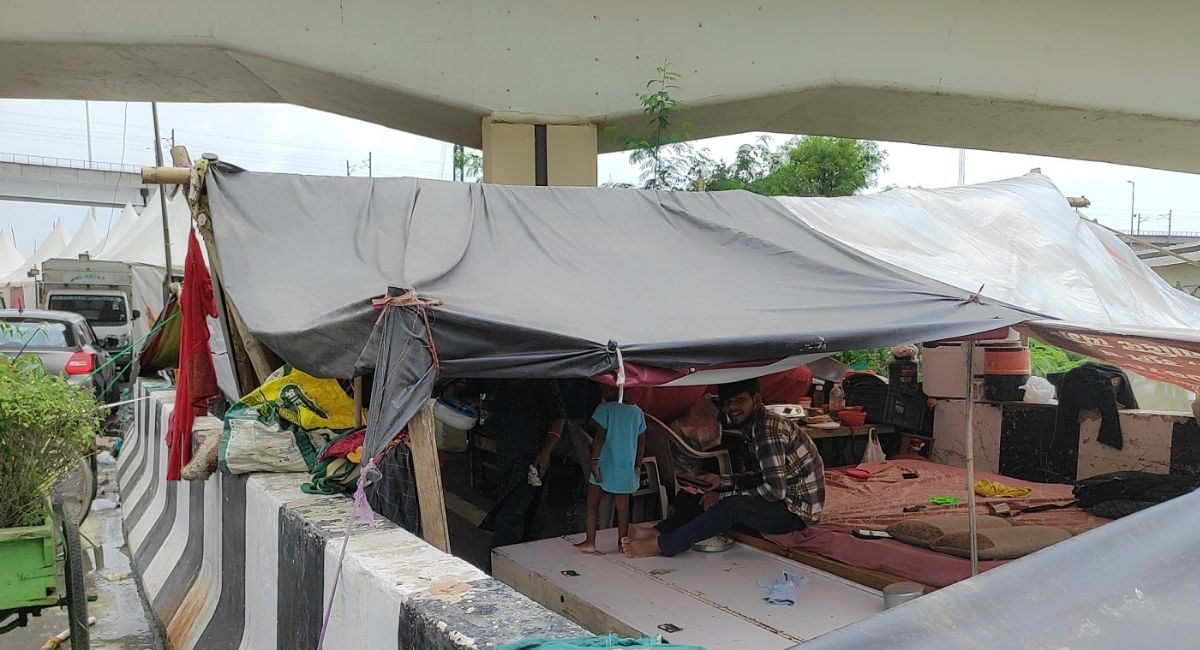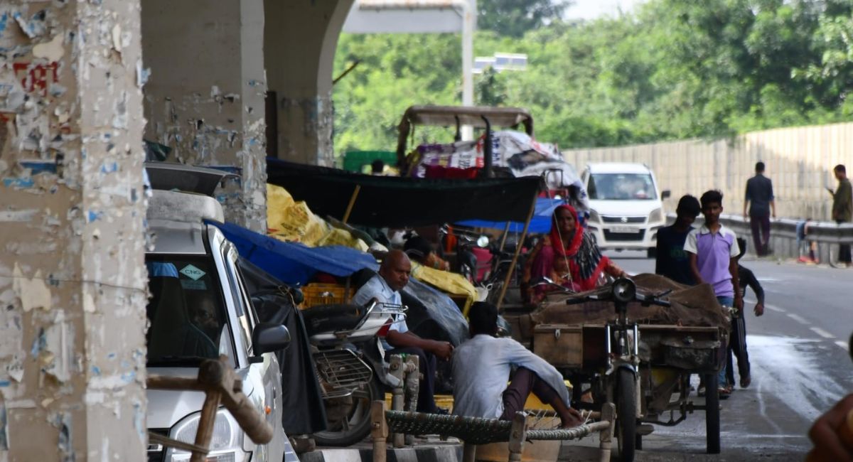 मयूर विहार के पास सड़क किनारे फुटपाथ पर सामान रख रहते खादर में रहने वाले लोग। जागरण