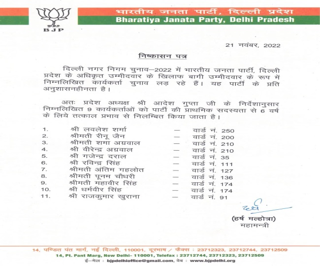 Delhi MCD Election 2022: टिकट कटने पर बगावत करने वाले नौ नेता छह साल के लिए भाजपा से बाहर, देखें लिस्ट