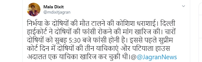 नई दिल्ली [माला दीक्षित]। निर्भया के दोषियों की फांसी टालने की कोशिश एक दिन में दो बार धराशाई हो गई। दिल्ली हाई कोर्ट ने भी दोषियों की फांसी रोकने की मांग खारिज कर दी है। चारों दोषियों को सुबह 5:30 बजे फांसी होनी है। इससे पहले सुप्रीम कोर्ट दिन में दोषियों की तीन याचिकाएं और पटियाला हाउस अदालत एक याचिका खारिज कर चुकी थी।