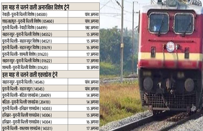 बता दें कि विशेष ट्रेनों के साथ ही कई एक्सप्रेस ट्रेनों की घोषणा की गई है। सबसे ज्यादा दिल्ली से सहारनपुर और हरिद्वार के बीच विशेष व एक्सप्रेस ट्रेनों का परिचालन शुरू होगा। इससे दिल्ली से इस रूट पर यात्रा करने वाले यात्रियों को लाभ होगा।