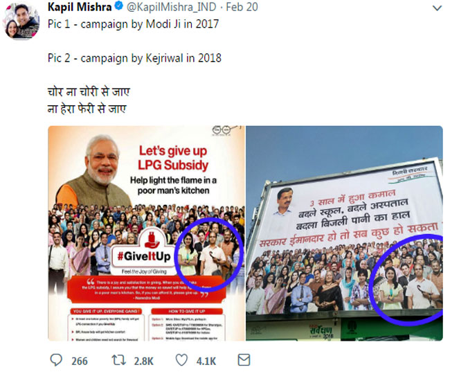 दरअसल, सोशल मीडिया पर दो विज्ञापनों का पोस्टर शेयर किया जा रहा है। इसमें एक केंद्र सरकार की योजना का तो दूसरा अरविंद केजरीवाल सरकार का विज्ञापन है। केंद्र सरकार के विज्ञापन में पेट्रोलियम एवं प्राकृतिक गैस मंत्रालय की तरफ से देश के लगभग 90 लाख लोगों को गैस सब्सिडी छोड़ने के लिए शुक्रिया कहते हुए कुछ लोगों की तस्वीरें हैं। वहीं, केजरीवाल सरकार पर इस तस्वीर को चोरी कर अपने विज्ञापन में लगाने का आरोप लग रहा है, क्योंकि दोनों विज्ञापनों में एक ही तस्वीर का प्रयोग हुआ है।
