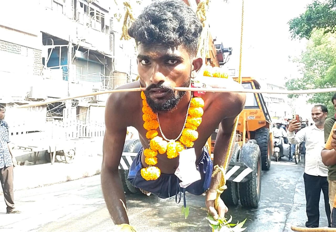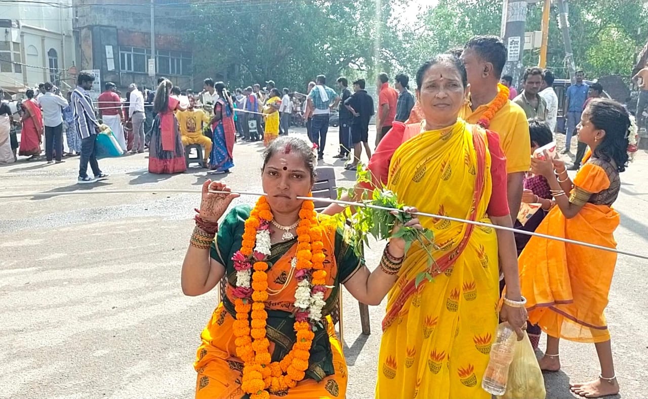 श्रद्धालु 12 फुट लंबे त्रिशूल को अपने गाल के आर-पार करते हैं