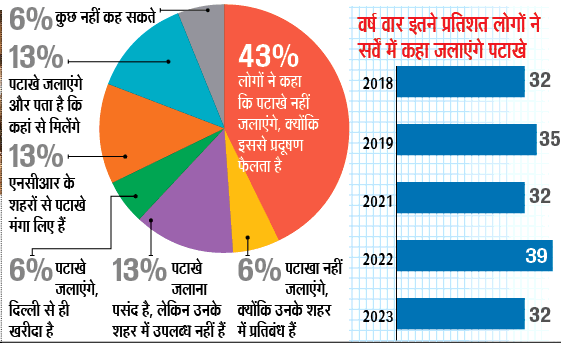 गैर सरकारी संस्था लोकल सर्किल्स के सर्वे के अनुसार एनसीआर के हर तीन में से एक व्यक्ति दीपावली पर पटाखे छुड़ाने के पक्ष में है। वर्ष 2018 में सुप्रीम कोर्ट ने दिल्ली में ग्रीन समेत हर तरह के पटाखे छुड़ाने पर प्रतिबंध लगाने का आदेश दिया था लेकिन पड़ोसी शहर नोएडा गाजियाबाद गुरुग्राम और फरीदाबाद में ग्रीन पटाखे छुड़ाने पर प्रतिबंध नहीं है।