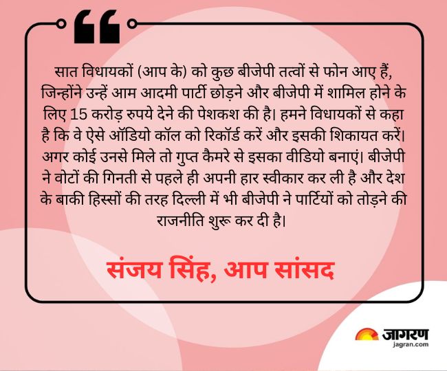 डिजिटल डेस्क, नई दिल्ली। दिल्ली में चुनाव खत्म होने के बाद अब सभी को 8 फरवरी का इंतजार है। क्योंकि इसी दिन वोटों की गिनती होगी। कौन जीतेगा और किसकी हार होगी। इसी दिन पता चलेगा। इन सबके बीच आप सांसद संजय सिंह ने कहा कि विधानसभा चुनाव लड़ने वाले (आप के) सात विधायकों से संपर्क किया गया और उन्हें 15 करोड़ रुपये की पेशकश की गई।