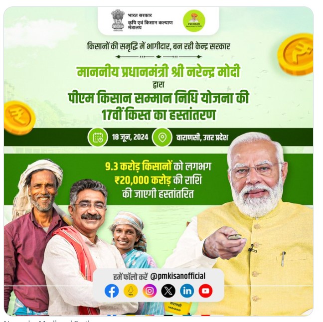 नरेंद्र मोदी ने तीसरी बार प्रधानमंत्री पद का कार्यभार संभालने के बाद पीएम किसान योजना की 17वीं किस्त (PM Kisan 17th Installment) जारी करने की घोषणा की, यह लगभग 20,000 करोड़ रुपये है, जो 9.3 करोड़ किसानों तक पहुंचेगी। ताजा जानकारी के मुताबिक, पीएम मोदी 18 जून को वाराणसी से लाभार्थी किसानों के लिए पीएम-किसान योजना की 17वीं किस्त जारी करेंगे।