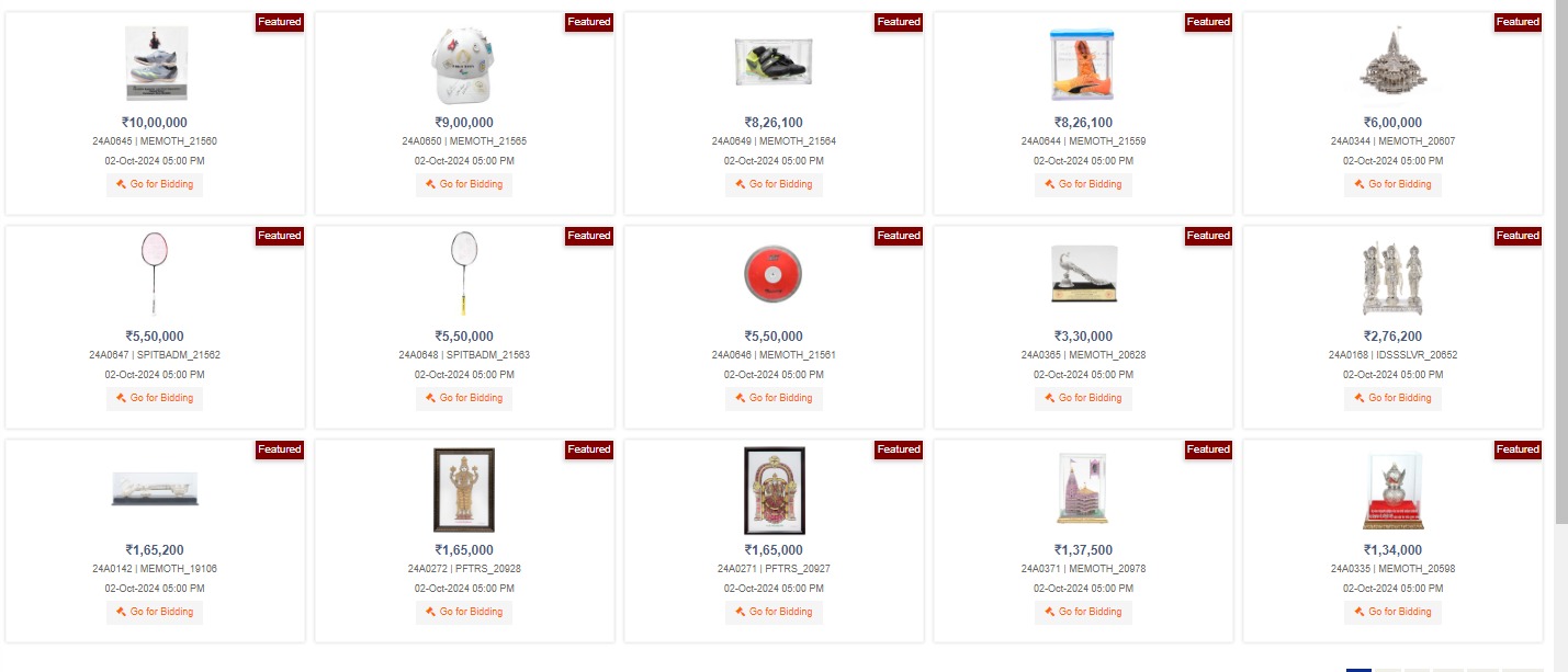 नीलामी में धार्मिक वस्तुओं में श्री राम मंदिर (अयोध्या), श्री द्वारकाधीश मंदिर (द्वारका) के सुंदर मॉडल और हिंदू देवी-देवताओं की शानदार मूर्तियां हैं। वहीं अंगवस्त्र, शॉल, पगड़ी, स्पोर्ट्स शूज, रैकेट, डिस्कस, चांदी का मोर, चांदी का वीणा, चांदी का और समारोहिक तलवारें जैसे सम्मान के प्रतीक उपहार भी नीलामी के लिए रखे गए हैं। ई-नीलामी में 700 रुपये से लेकर 10 लाख तक की कीमत के सामान हैं।