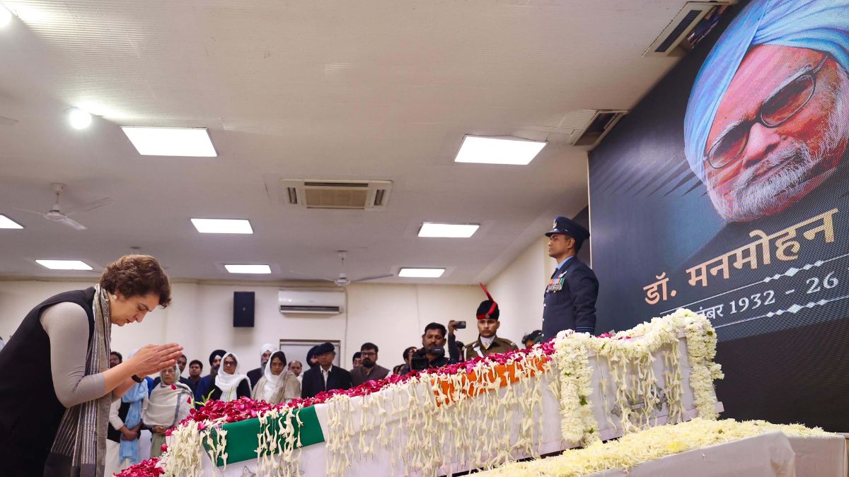 पूर्व प्रधानमंत्री मनमोहन सिंह के पार्थिव शरीर को श्रद्धांजलि देती सांसद प्रियंका गांधी वाड्रा। फोटो- जागरण
